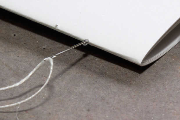 Asegúrese de que la aguja pasa a través de los seis pedazos de papel, que sale en el medio de la firma, en la línea de doblez.