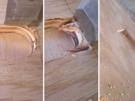 Después de la ruta es posible que observe que ha redondeado la ranura de la broca de fresadora. Para solucionar esto nos agarró un cincel de 3/4" y enfrentaron cada borde para hacer la Plaza de las ranuras, así que encajaría los rieles.