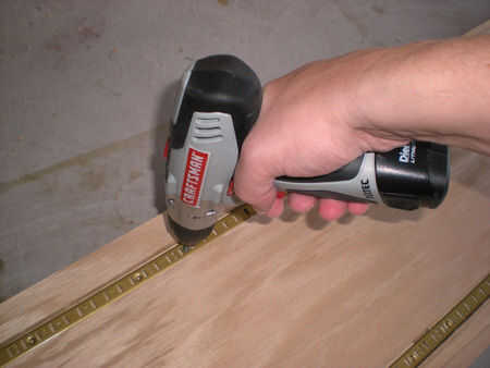 a continuación atamos los rieles a las juntas, que fue trabajo con unos 5/8" tornillos para madera y nuestro taladro Craftsman. Tenga cuidado de no tira los tornillos de apriete, o a sus estantes no llevar mucho peso.