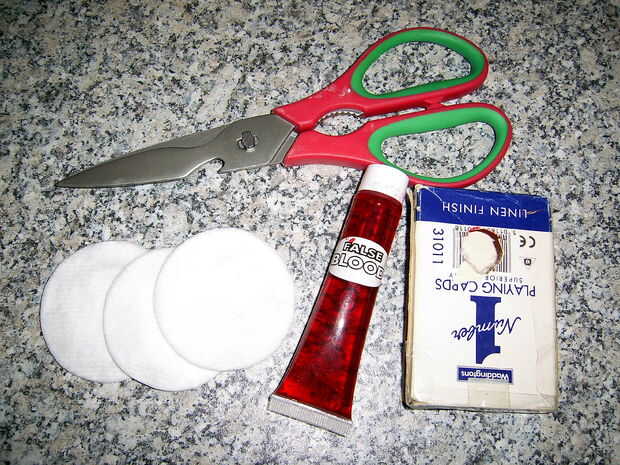 a continuación se presentan los elementos necesitados. -tijeras -falsa sangre -cojines de algodón aproximadamente 3 / o bolas -una caja pequeña (elegí un naipe caja, todo que tuve)