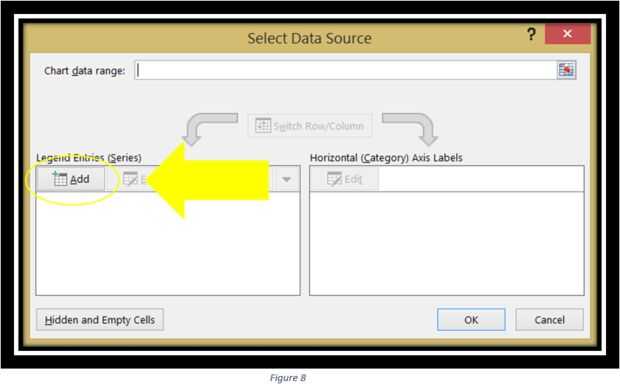 En la nueva barra de herramientas seleccione "Seleccionar datos". Esto hará que aparezca un cuadro de "Seleccionar origen de datos". En el cuadro de "Seleccionar origen de datos", seleccione "Agregar". El cuadro de "Seleccionar origen de datos" con "Add" destacado puede encontrarse en la figura 8.