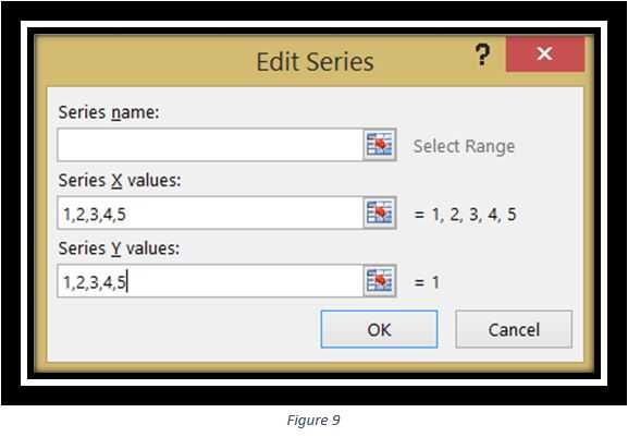Después de seleccionar "Añadir", aparecerá el cuadro de la "serie de Editar". Aquí entras tu x e y valores. La figura 9 muestra la correcta entrada de datos utilizando valores de x e y de 1, 2, 3, 4 y 5.