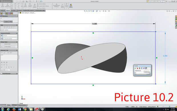Haga clic en los lados de tu rectángulo bosquejado a dimensiones respectivos de la parte. Cuando seleccionas un lado aparecerá un cuadro de texto. De entrada la dimensión deseada para cada lado en el cuadro de texto. Para este instructivo, la longitud se estableció en 15 pulgadas y la altura se establece en 6 pulgadas (como se ve en el cuadro 10.2).