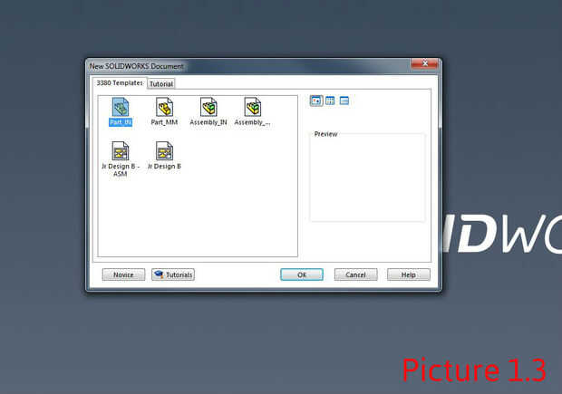 Una vez que se abre la ventana de "Nuevo documento de SOLIDWORKS", seleccione "Part_IN" y haga clic en el botón "OK" (como se ve en el cuadro 1.3).