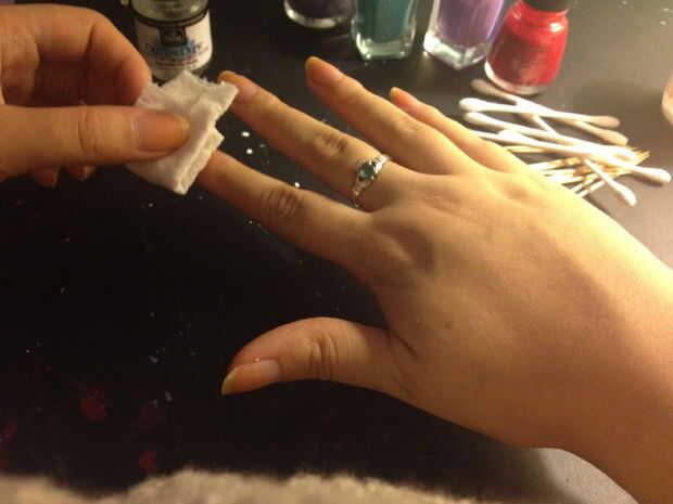 Hacer que los clavos estén limpios y no tienen ningún esmalte anterior en él. Remoje una bola de algodón con el removedor del pulimento de clavo y sacar todas uñas previo antes de seguir los siguientes pasos.