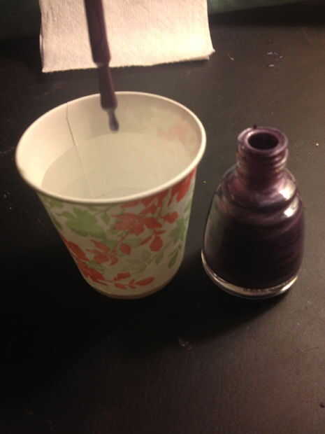 Tomar su primer esmalte deseado y el cepillo de la botella con suficiente producto en lo que el goteo de color en la taza de dixie.
