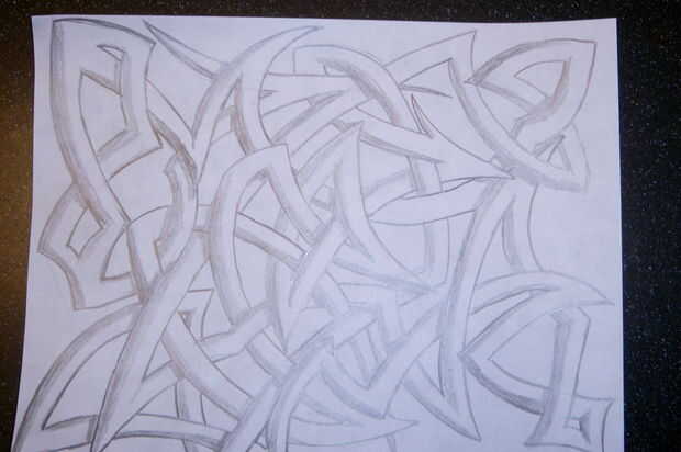 Los segundo y terceros los dibujos son de un diseño más uniforme. Hizo una imagen de espejo mediante la creación de una línea de simetría (una línea vertical muy ligera) y dibujó un diseño a la izquierda de él, pero tenía partes toque la línea, entonces doblada el papel de sobre manera que el grafito sobre el papel el lado opuesto de la línea vertical para que cuando escribo en la parte posterior del papel que hace una copia de sí mismo en el otro lado de la línea vertical. Así que ahora es una imagen perfecta.