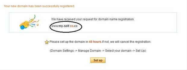 9) si el dominio está disponible, entonces su dominio es registrado con éxito, como la imagen de abajo 10) y a continuación, haga clic en "Configuración"