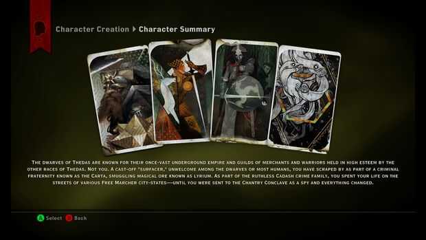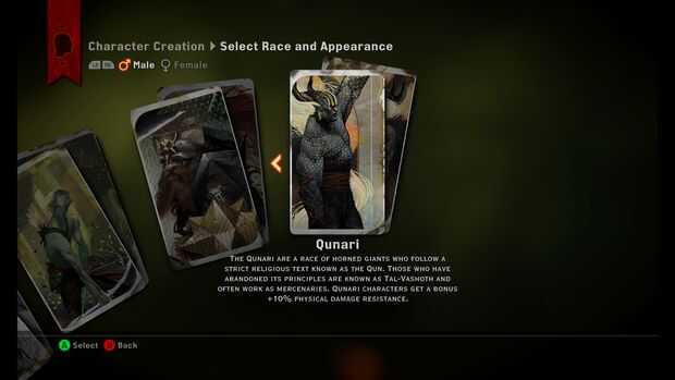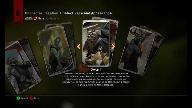 Nota: Las cuatro razas; Humano, elfo, enano y Qunari (una raza única en el juego que se asemejan a gigantes de piel gris con cuernos); cada uno tiene beneficios como se puede ver en las fotos y en el juego. Las interacciones sociales también se ven afectadas por esta opción como razas no siempre consiguen adelante.