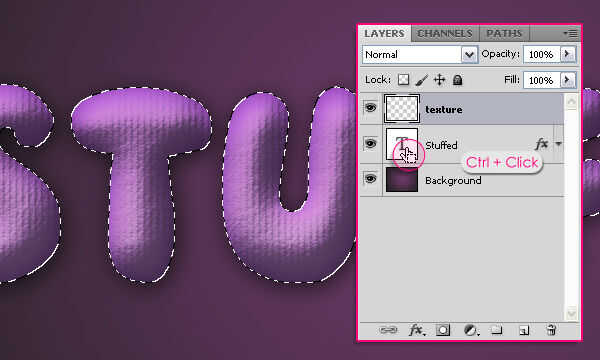 Pulse la tecla Ctrl y haga clic en la miniatura de la capa de texto (icono) para crear una selección.
