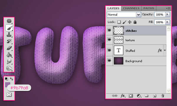 Crear una nueva capa encima de todas las capas, lo llaman "puntadas" y establecer el color de primer plano a #9b79a8.