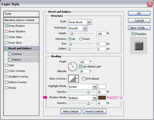 -Bisel y relieve: cambiar el modo de sombra color #60371 d.Esto agregará más profundidad y dimensión a los puntos de sutura.