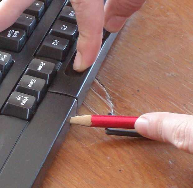Tomar la siscors y corte el cordón bastante cerca del cuerpo del teclado. Esto no debería ser demasiado difícil. A continuación, tome el objeto puntiagudo agudo, (utilicé un lápiz) y rechazar el resto del cable en el agujero. Asegúrese de no cortar el cordón demasiado cerca, u otra cosa esto no trabajará, y quedará un poco de cable pegado por la parte trasera. Si eres capaz de meter el cable en el agujero, no sería sensible en todo.