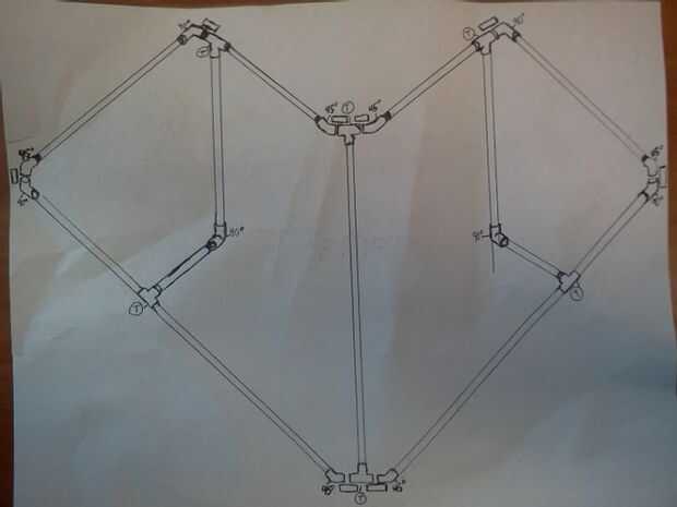 Ahora que sabemos que la base que necesitamos para cubrir con la pirámide, también necesitamos saber el tamaño de la etapa que estamos utilizando en caso de tenga alguna limitación de tamaño. Entonces podemos empezar por construir el marco de la pirámide. Vamos a empezar con la construcción de la parte superior de la parte inferior de la pirámide, comenzando en el medio. Tomar un conector T y 2, 2" piezas de pvc (permite llamar a estos espaciadores). Inserta en el lado de alojamientos de la T con el centro de la T hacia abajo y a un ángulo de 45° hacia adelante. Luego conecte un pedazo de ángulo de 45° a cada uno de los 2 espaciadores que estos celebrará los rieles superiores tan ángulo en consecuencia. Nota: no pegar nada juntos hasta llegar a través de la 1 º marcha en seco, entonces usted puede marcar una línea en cada una de las conexiones así que usted puede pegar en el mismo lugar exacto más adelante.