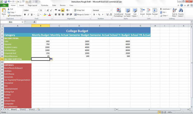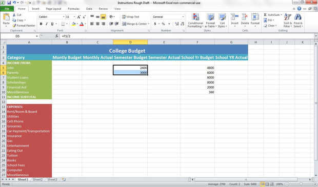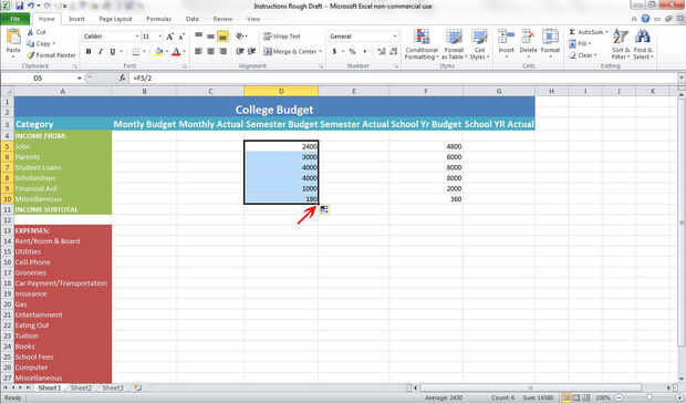IV. el proceso de llenado en las categorías de ingresos mensuales de presupuesto es esencialmente el mismo como lo fue para las categorías de ingresos presupuesto de semestre. Para empezar, seleccione la celda B5 y escriba "= F5/8" (Nota: este presupuesto hemos asumido que un semestre es de cuatro meses, por lo tanto consistiría en un curso de dos semestres de 8 meses). Seleccione la celda B6 y escriba "= F6/8" y luego seleccione celdas F5 y F6. Utilice la función de Autorrelleno mencionada anteriormente para rellenar celdas F7 F10.