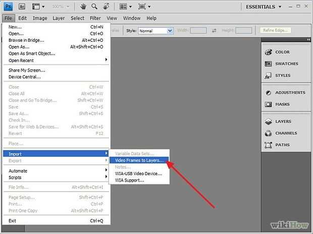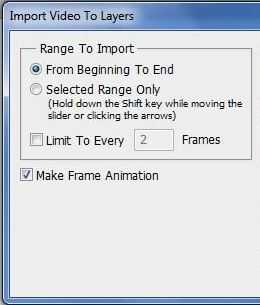 Ve a archivo y a continuación, importar. Haga clic en fotogramas de vídeo a capas. Seleccione su video y haga clic en carga. Asegúrese de que es un video que puede reproducir en Photoshop. Los formatos soportados son. MOV. AVI. MPG. MPEG, y. MP4. Asegúrese de que usted golpea de principio a fin si desea que el clip completo en un gif. Si no entonces lo acortar antes de hacer esto.