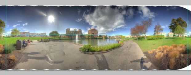 El siguiente paso es a nivel de la imagen y limitar a sólo 360°. Lo hago colocando dos guías verticales en el mismo elemento que se repite en ambos extremos de la foto que esta me da m 360°. Luego colocar a una guía horizontal en la intersección entre el horizonte y mi guía vertical en el lado izquierdo. Desplazamiento a la derecha la guía lateral compruebo que se intersección también el horizonte en el mismo punto. Si no es necesario girar la imagen hasta que coincida con el horizonte. Una vez que tengo el nivel de tiro que los cultivos a las líneas de 360°