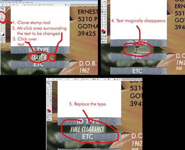 Una vez que haya terminado de quitar todo el texto (sí, todos de la misma. Y luego reimpreso texto miradas terribles), llenarlo en el uso de la herramienta texto. Tienes que probar y combinar la fuente para en su DNI. Si no puedes, Helvetica o Helvetica condensada es una buena opción para una tipografía de aspecto oficial.