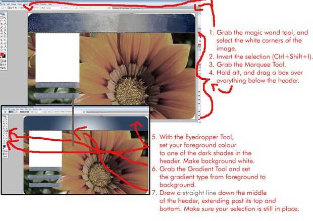 Siguiente, encontrar una manera de activar la casilla. Esto debería ser fácil si no tiene esquinas redondeadas. Sólo escoge la herramienta recuadro seleccionar y resaltar la zona. Si su área es de una forma extraña, como la cabecera con esquinas redondeadas en la tarjeta del ejemplo, consulte los pasos 1-4 de la imagen de abajo.