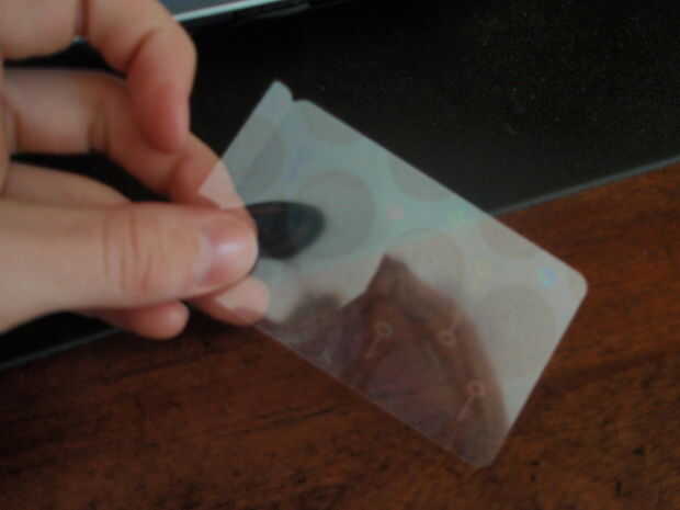 Si todavía tienen las burbujas en el holograma, use la parte posterior de un cuchillo o un rodillo para forzar hacia fuera.