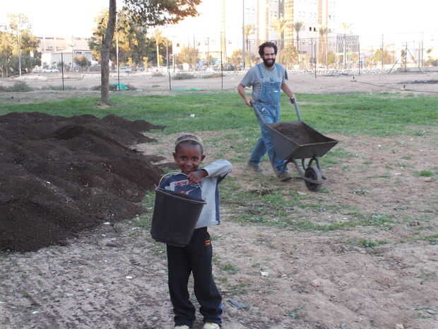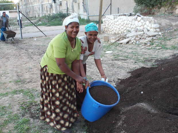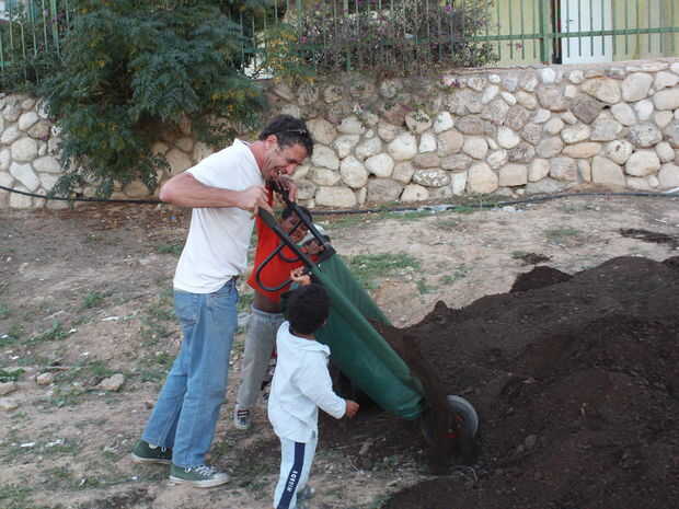 Uno de nuestros mayores errores primeros que resultaron para ser un montón de diversión fue el compost. Había un camión cargado de abono entregado después que ponemos encima de la valla. Probablemente habría sido más inteligente soltar el compost en el jardín y luego poner la valla para arriba. Terminamos por tener que transporte el compuesto por cubos y carretillas. Había creado una "jornada de trabajo" y a la comunidad para ayudar a. Esto ha generado mucho entusiasmo de la comunidad y los voluntarios.