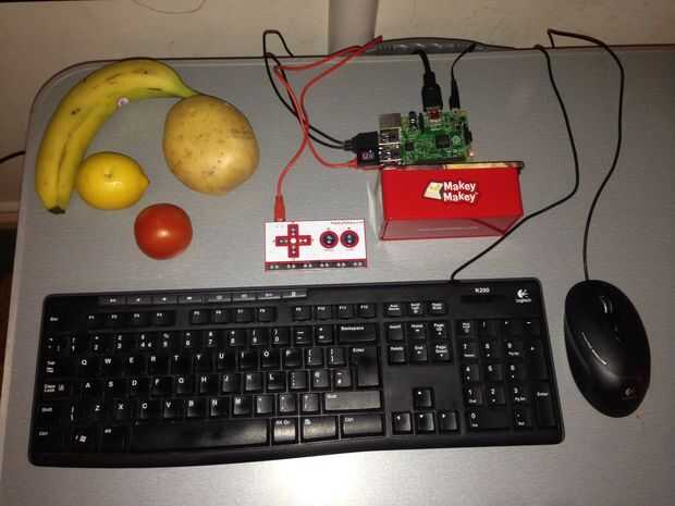 Conectar pinzas cocodrilo a las teclas de izquierda/derecha/arriba/abajo y el botón de tierra de Makey Makey. Conecte los otros extremos de los cables de cocodrilo arriba/abajo/izquierda/derecha para frutas/verduras - esto puede hacerse simplemente apuñalando los conectores en la fruta/verdura pero me parece que es más confiable si usted abre las mandíbulas del cocodrilo antes de hacerlo - la conexión parece más fuerte y la conexión es permanente. Deje el otro extremo del cable de tierra suelta.