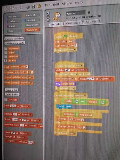 - la cadena final dice lo que sucede cuando el usuario toca uno de nuestros objetos (frutas/verduras) - si es el primer contacto del juego entonces el temporizador se restablece (para las competiciones! Seleccione el temporizador para que sea visible); entonces si ha seleccionado el objeto esperado aumentamos el contador de "derecha" por uno, si no aumentamos su contador "mal" Finalmente activará el siguiente turno para empezar a