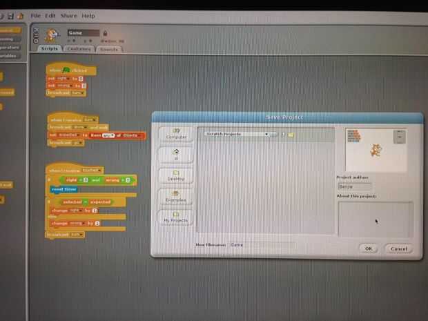 Por supuesto es una buena idea para guardar su trabajo, para hacerlo haga clic en el guardar botón, establezca su nombre de autor y elegir un nombre de archivo para su juego.