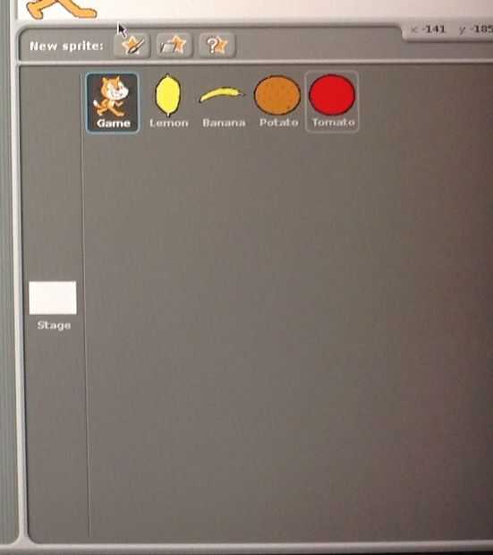 Ahora queremos crear un sprite nuevo para cada uno de nuestros objetos (frutas/verduras); hacer prensa tan a mano la izquierda "nuevo Sprite:" icono en la "etapa" y dibujar el objeto en el cuadro de diálogo que aparece. Una vez que estés feliz, pulse "OK" y luego cambiarle el nombre como lo hicimos para el sprite del juego. Como se puede ver, claramente soy un artista muy hábil.