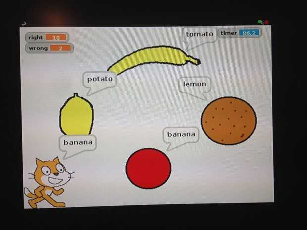 Para jugar al juego, debes encontrar y tocar la fruta que dice ser la fruta que arañar el gato está diciendo. Por ejemplo aquí cero dice "banana" y el tomate está pretendiendo ser un plátano, y así debe tocar el tomate!