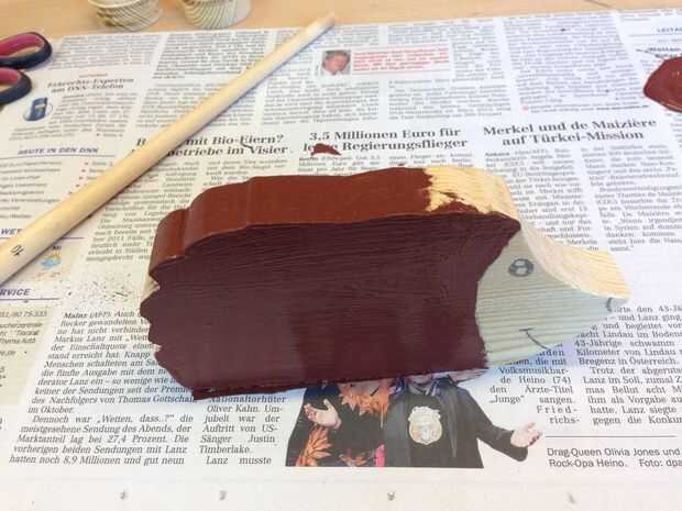 En primer lugar, usted necesita establecer un esquema donde usted quiere el juguete de color. Por ejemplo, la cara, puesto que tiene un color marrón más claro que el resto del cuerpo. Para el cuerpo utilicé sólo un marrón oscuro de la botella. Para la cara luego blanco mezclado con el color marrón para conseguir un tono más ligero. Después de eso saqué los ojos, la boca y la nariz en la cara con un marcador permanente porque es mejor y más fácil que usando pintura.