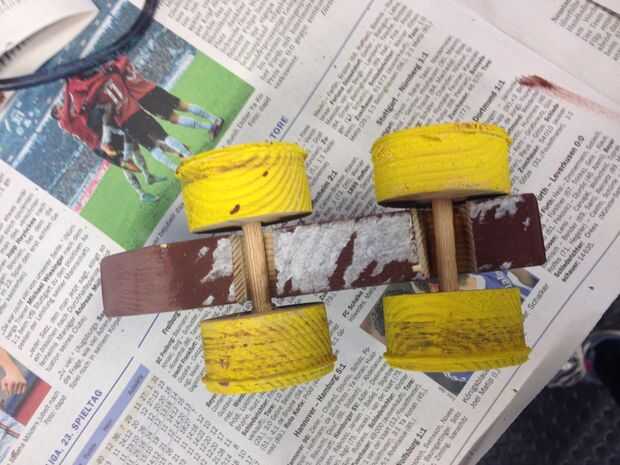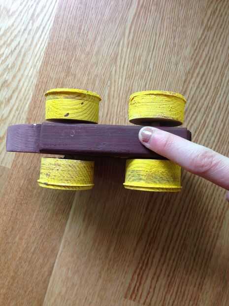 Una vez que han atado las ruedas, voltee el juguete, por lo que la parte con los cuadrados de los ejes en la parte superior. Poner los ejes en los agujeros y luego pegar la pieza de madera adicional a la parte inferior.