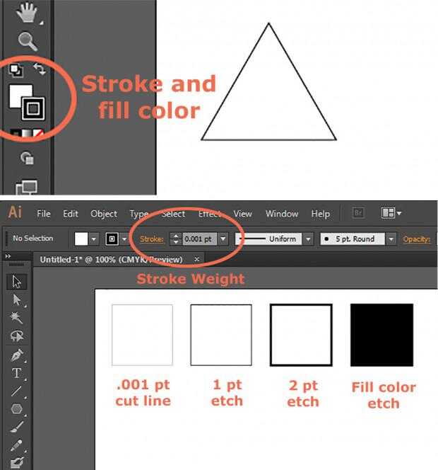 Para la mayoría cortadoras láser, cualquier cosa con un grosor de trazo de pt.001 o menos será una línea de corte y nada por encima que será un etch. Cualquier área de también ser grabada.