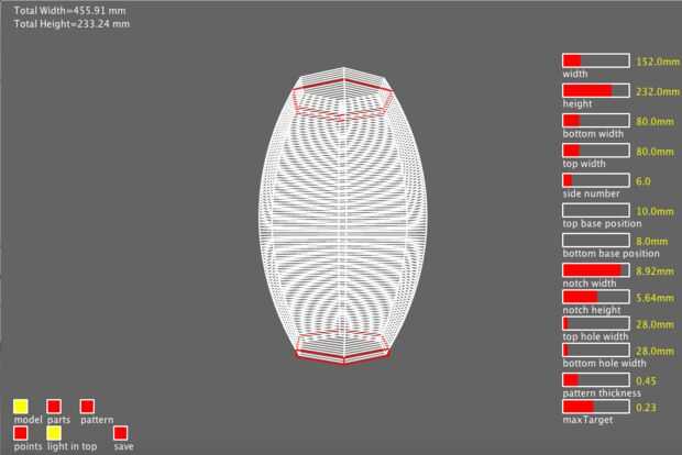 En la carpeta de proceso, encontrará otra carpeta llamada "codeableObjects." Arrastre la carpeta codeableObjects en la carpeta que se llama "Bibliotecas". (Importante: las bibliotecas no es lo mismo como biblioteca) Abrir codeableObjects y elegir un diseño (Polar Rose, al azar, espiral, etc.) Abra el archivo y pulse el botón play. Debe aparecer una ventana emergente en la aplicación de Java, que muestra un prisma con los cursores (vea la imagen de arriba). Ajustar estos deslizadores hasta obtener el diseño que desee. OTRA cosa importante: Tienes que cambiar la posición de base inferior para encajar la parte inferior de la bombilla.
