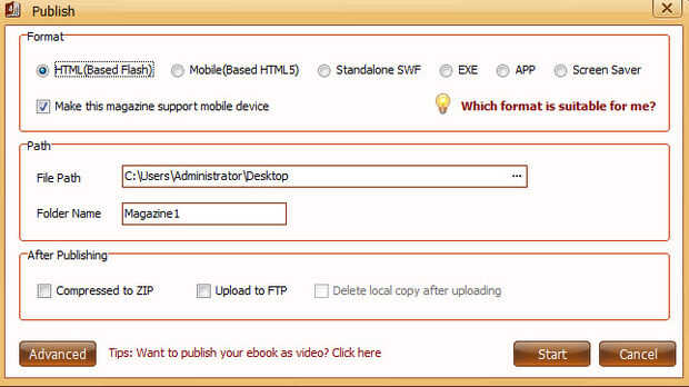 Luego diríjase al botón de publicar y seleccione un formato de salida de flipbook. Tenga en cuenta que también puede definir el título, Descripción y etc para el flipbook haciendo clic en el botón avanzadas.