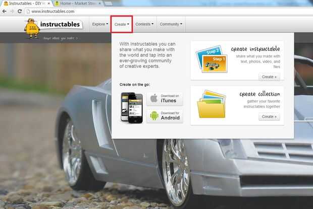 Desplácese hasta la ficha "Crear" en la parte superior de la página de inicio de Instructables.com y empezar a crear tu Instructable para su proyecto