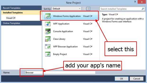 Este instructable le mostrará cómo hacer un navegador web en Visual Studio 2013.Paso 1: La plantillaAbra un nuevo proyecto en Visual Studio y seleccione "Aplicación de Windows Forms".Paso 2: Conseguir lo que necesitaA continuación, vaya al cuadr