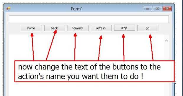 Im que va a enseñar cómo hacer un navegador web en Visual Basic 2005.Paso 1: a partir de Abierto Visual Basic y empezar una nueva aplicación de Windows.Paso 2: Agregar las herramientas de Añadir a:Cuadro de textoNavegador web5 botonesen ese orden.Pas