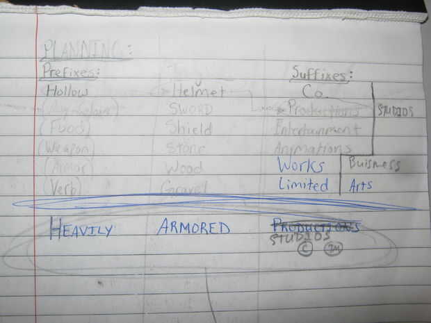 Búscate un pedazo de papel y un lápiz, porque aquí viene la parte más difícil de cada paso que usted puede imaginar! En primer lugar, usted necesitará subir con un nombre, por supuesto, después de que usted ha averiguado el tipo de negocio que se está creando. La forma más sencilla de hacer esto, es pensar en un montón de palabras aleatorias, escríbalas, e Inicio coincidencia de algunos de ellos, entonces, al final de la palabra que has puesto juntos, seguir con las producciones, estudios, películas, animaciones, o, lo que su negocio está en línea con. Decirte que eres negocio fue intwined con la comida y las dos palabras que había puesto juntos eran especias y arroz, se podría seguir por alimentos, especias-arroz alimentos. Mi negocio, ' pesadamente blindado Studios ©' que había venido para arriba con porque los juegos utilizo siempre vinculan a tiempos medievales, y solía estudios vinculan al hecho de que estoy grabando mi trabajo, pero también, hacer que suene como el estudio está 'blindado' como un castillo.