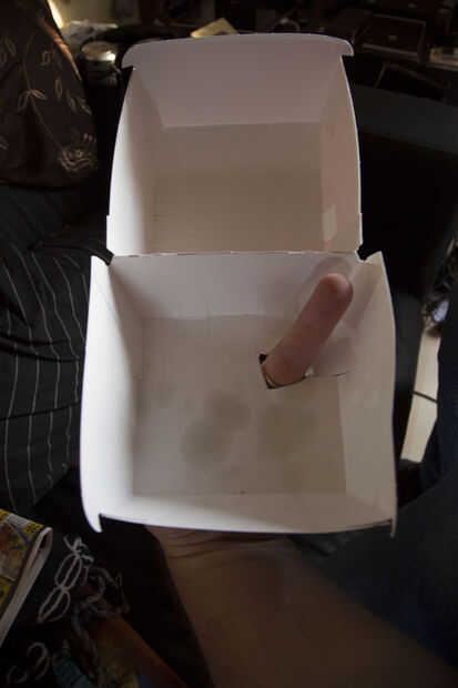 Ahora puede doblar el dedo hacia abajo sosteniendo la caja para que se vea como un dedo cortado que se establecen en el cuadro. (Ahora la posición del agujero debe hacer sentido para usted.)