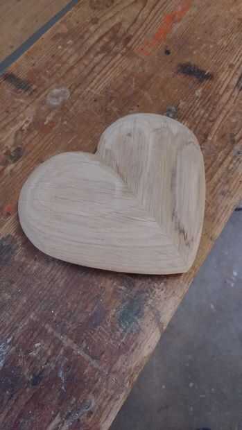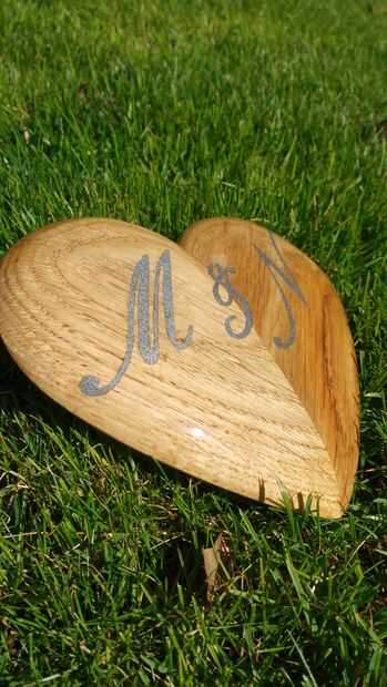 El primer paso de la creación de este regalo de boda es encontrar dos piezas de madera, en este caso roble y encolarlos. Opté por pegarlos juntos para que la veta de la madera se conecta en ángulo de 90 grados. Después se pegan las dos piezas de madera tendrá forma el corazón. Primero lo hice con una sierra, luego con un cincel y finalmente con lija.