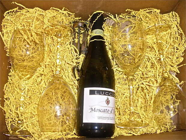 Después de que los vidrios se han secado durante 10 días, los embalamos con la botella de vino y abridor en una caja vacía. Asegúrese de tener algún tipo de amortiguador, como periódico o papel de tejido, por lo que no se rompen los elementos.