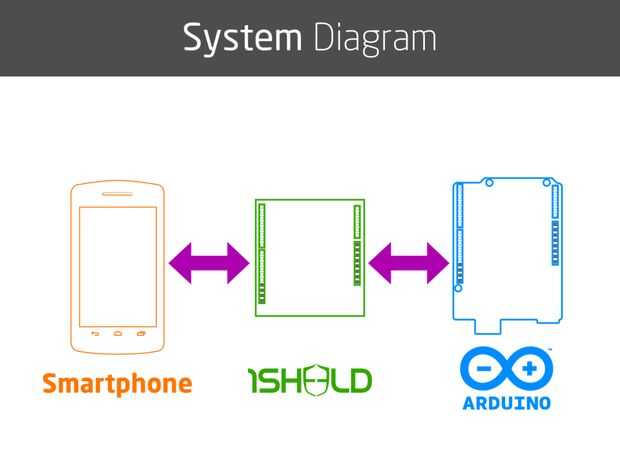 La primera parte es un escudo que está físicamente conectado a la placa Arduino y actúa como un hombre medio inalámbrico, tuberías datos entre Arduino y cualquier Android smartphone vía Bluetooth.