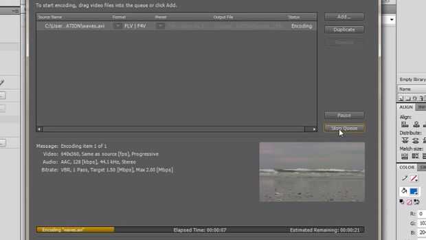 Codificar el archivo de vídeo. En el menú principal, seleccione Archivo, importar, importar vídeo. En la ventana resultante, haga clic en "Lanzamiento Adobe Media Encoder". Haga clic en aceptar en el cuadro emergente. En la ventana de Adobe Media Encoder, haga clic en "Agregar" y seleccione un video haciendo clic en "Abrir". Haga clic en "Iniciar cola" para codificar el vídeo. Cuando la barra de progreso haya terminado, cierre la ventana de Adobe Media Encoder.