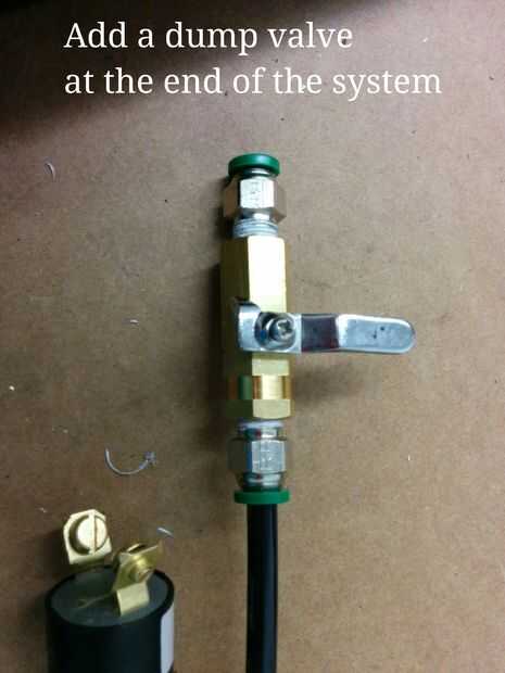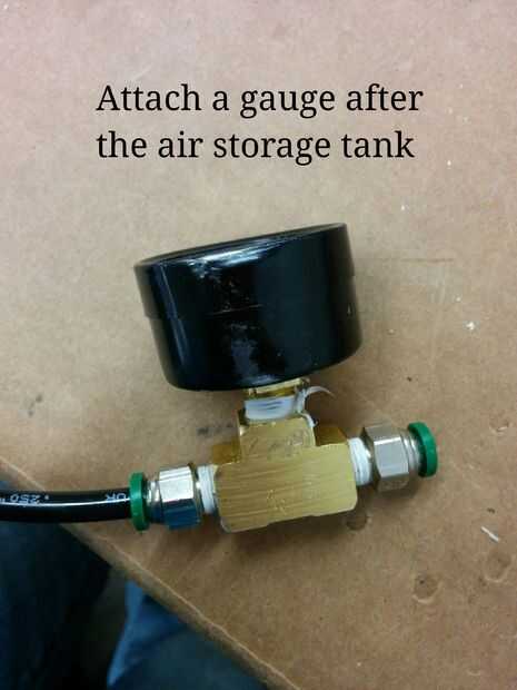 -Pase una recta 1/8" npt a 1/4" presión para conexión en el último agujero en el conector de latón T e Introduzca un pedazo de tubo, luego empuje el extremo expuesto de la tubería int un tanque de almacenamiento de aire. (fotos 12-13)
