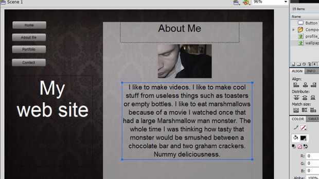 Agregar contenido. Seleccione el primer fotograma de la capa de páginas. En propiedades, cambie el nombre de etiqueta a la Página 1. Luego, utilice la herramienta texto del panel herramientas para crear el texto de la primera página. Cuando haya terminado, vaya a la capa de páginas, seleccione el segundo marco y repita el proceso. Continúe hasta que haya contenido para cada página.