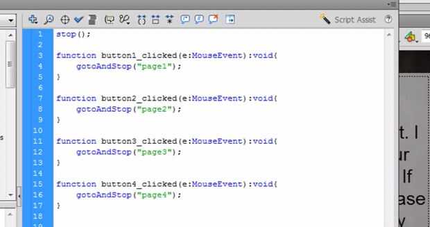Seleccione el primer fotograma de la capa Actions y golpear F9. En la ventana de acciones, escriba una secuencia de comandos de parada para detener las páginas de ciclismo. Pulsa Intro para ir a la siguiente línea y crear una función para cada botón que le dice que marco de página para ir a. Oprimir la tecla Enter y escribir un script que se conecta las funciones a sus botones correspondientes, utilizando el nombre de instancia del botón.