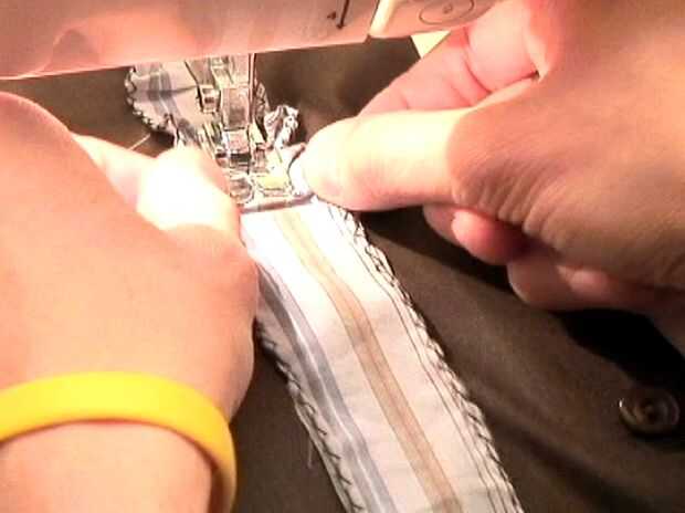 Desde el cuello hacia abajo, empezar a colocar sus tiras de tela. Para obtener el volante, solo crujir las tiras de tela debajo de la pata de la máquina de coser como ir y colocar a lo largo de su camisa.