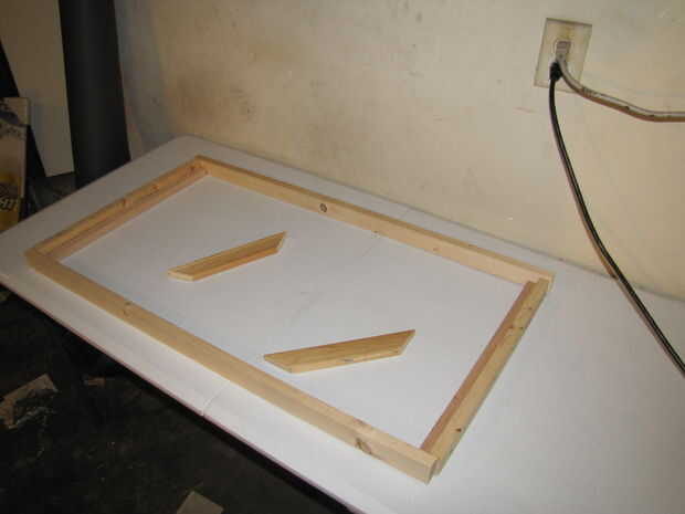 Para el marco de madera se pueden comprar madera de 1 x 2 mejoras para el hogar en más tiendas. Quiere atender a la rectitud en ambas direcciones de la madera que usted elija. 8 pies de él generalmente va por cerca de $1.50 por lo que es barato. En este caso ya tenía algunos restos de tendido sobre así que me gustaría reutilizar reciclar donde puedo. Tengo dos piezas largo cortadas recto en el 36" dos piezas más cortas recto corte hasta 18" y luego tuvo dos piezas más y hacer cortes de 45 grados en direcciones opuestas en cada extremo. Estos no es necesario ser una longitud precisa como hacerlos la misma.