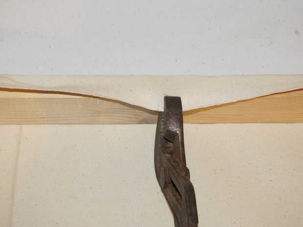 me gusta usar un par de pinzas de bloqueo de canal para agarrar el borde de la tela y tire en el extremo posterior del bastidor, pero he hecho sin pinzas también. Hacen pinzas especializadas para este fin pero me parece que es justo como fácil de usar un par de $5,00 de cerraduras del canal en la mayoría de los casos. Nuevo trabajo del centro y cada 1-2 pulgadas hasta aproximadamente 2 pulgadas desde el extremo de la grapa lo dejo solo. Una vez que haces tus lados largos como este vas a hacer lo mismo para los dos lados más cortos, dejando las últimas 2 pulgadas que es bastante apretado y estirado todo el perímetro excepto en las esquinas donde la tela se doblará hacia fuera. No te preocupes si tu lienzo no no necesita ser apretado del tambor. Está concentrado en lo que es libre de arrugas.